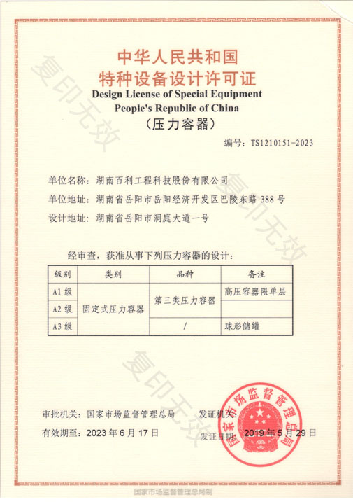 Design License of Special Equipment for A1, A2, A3 Categories (Pressure Vessel)